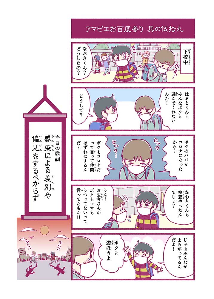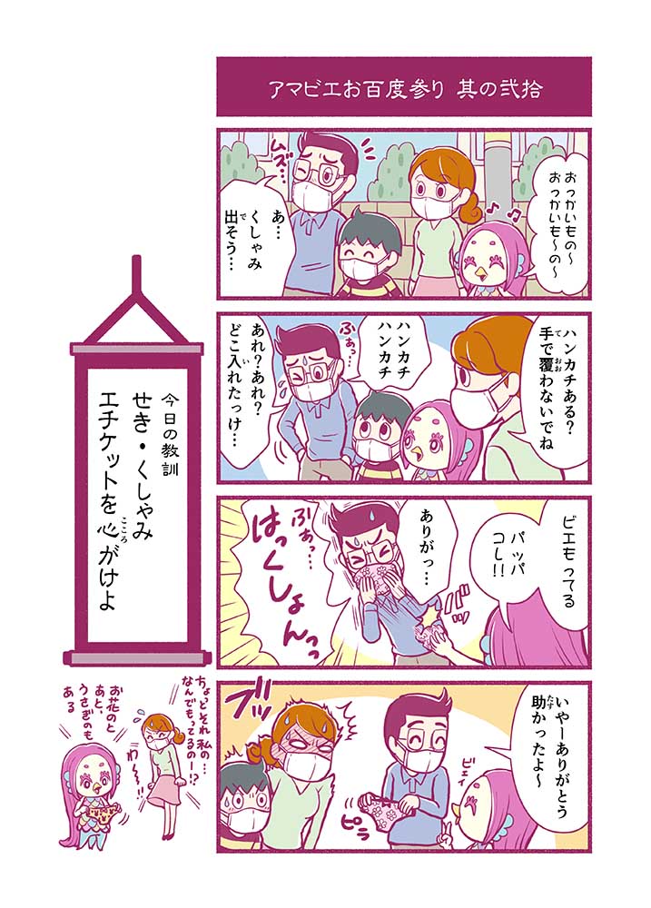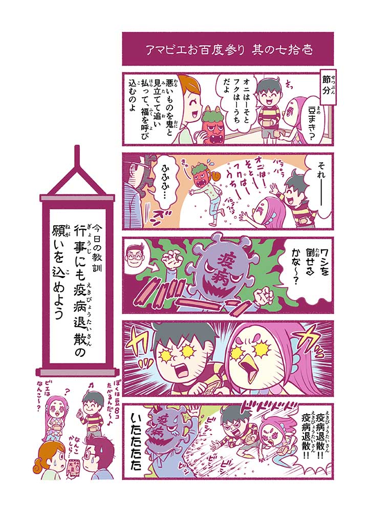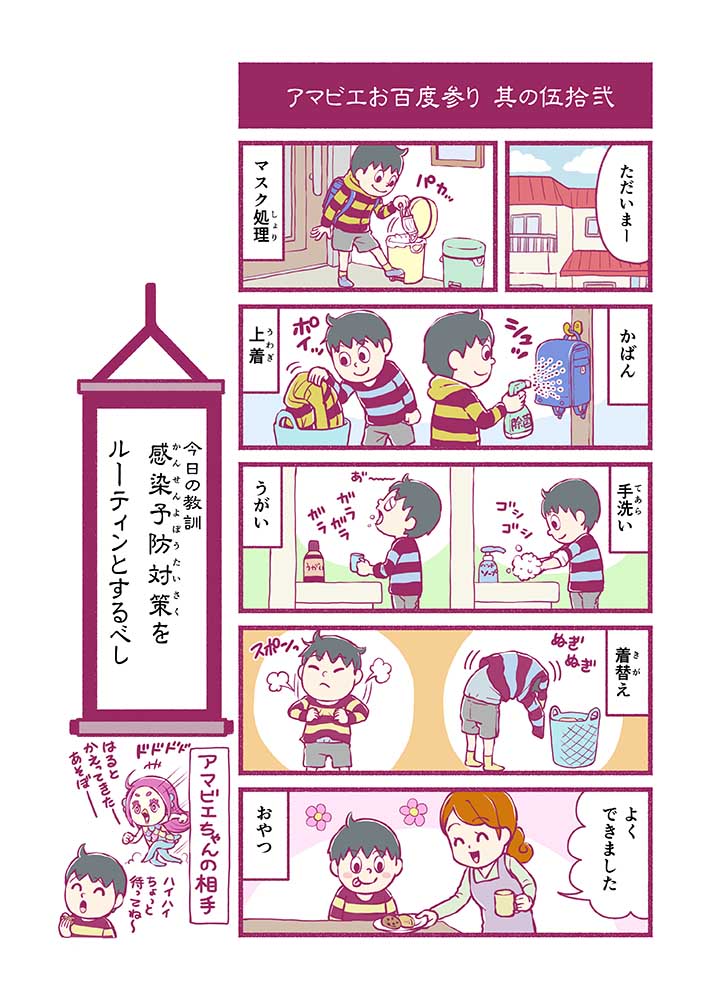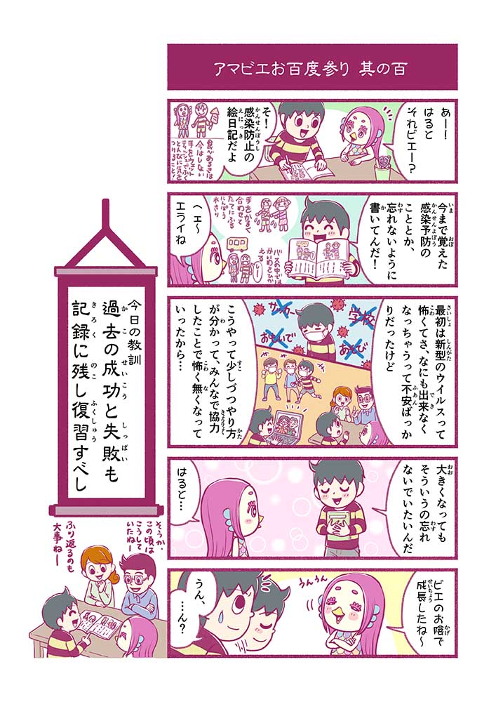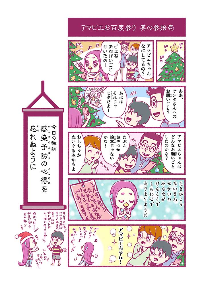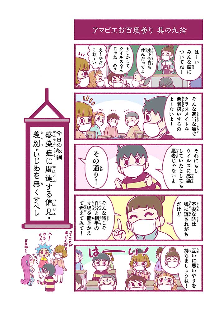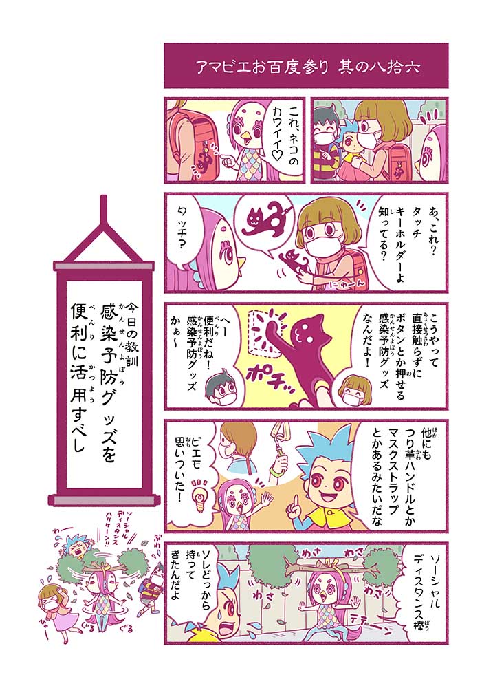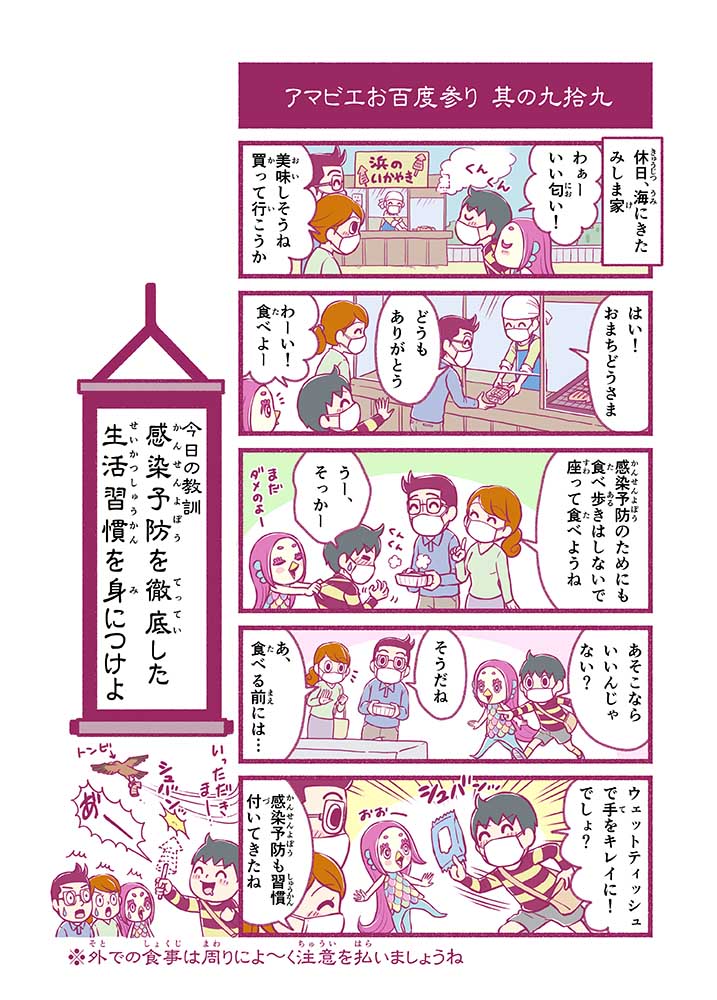 心から叶えたい願いを神様に届ける「御百度参り」をモチーフに100話マンガとして制作しました。 疫病を予言しその予防に備えるように発信したとされる伝説の妖怪アマビエちゃんとともに、新型コロナウイルス対策の一環となるような100作の感染予防マンガを配信しました。