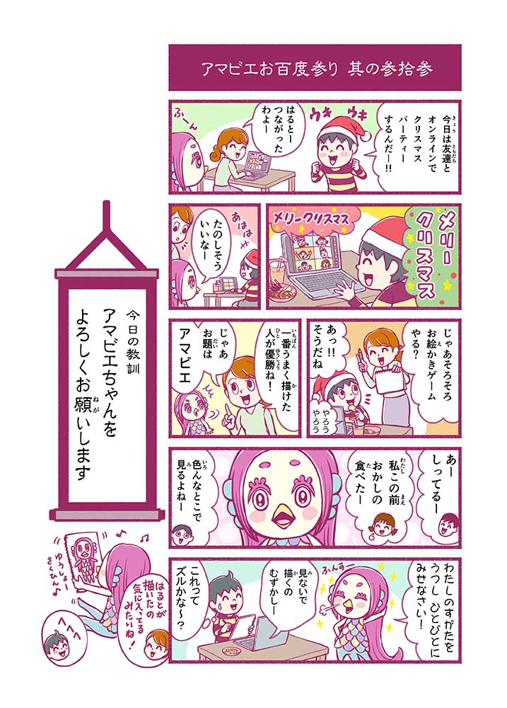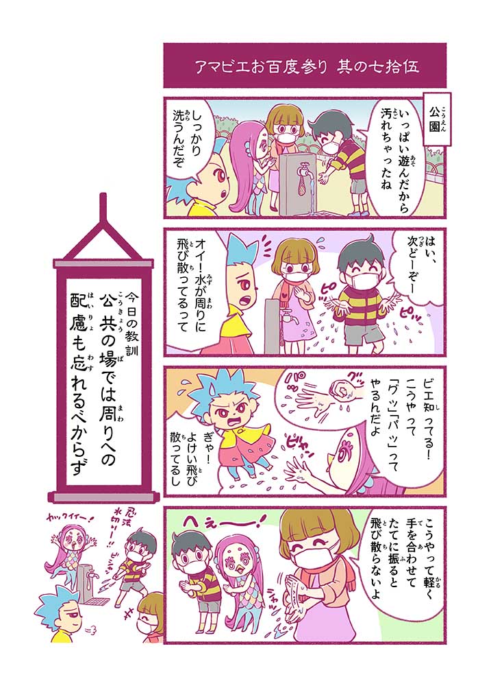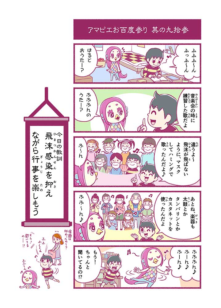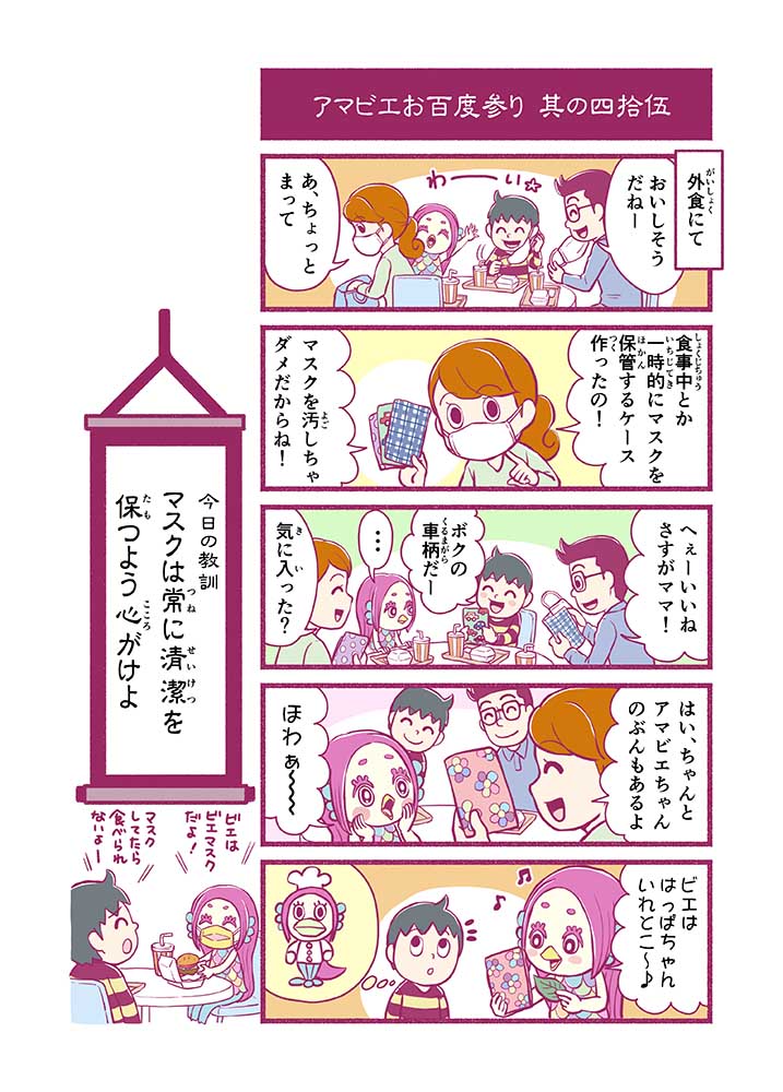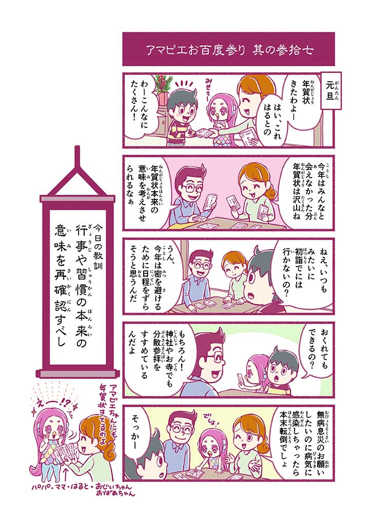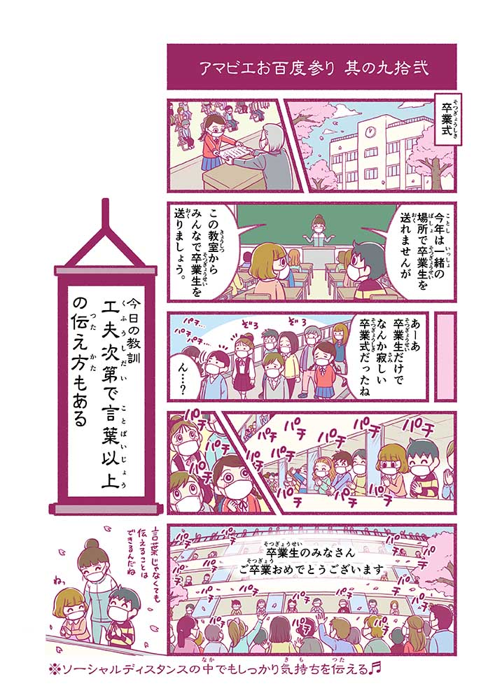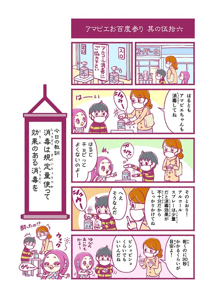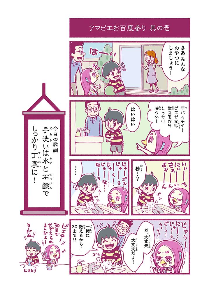心から叶えたい願いを神様に届ける「御百度参り」をモチーフに100話マンガとして制作しました。 疫病を予言しその予防に備えるように発信したとされる伝説の妖怪アマビエちゃんとともに、新型コロナウイルス対策の一環となるような100作の感染予防マンガを配信しました。