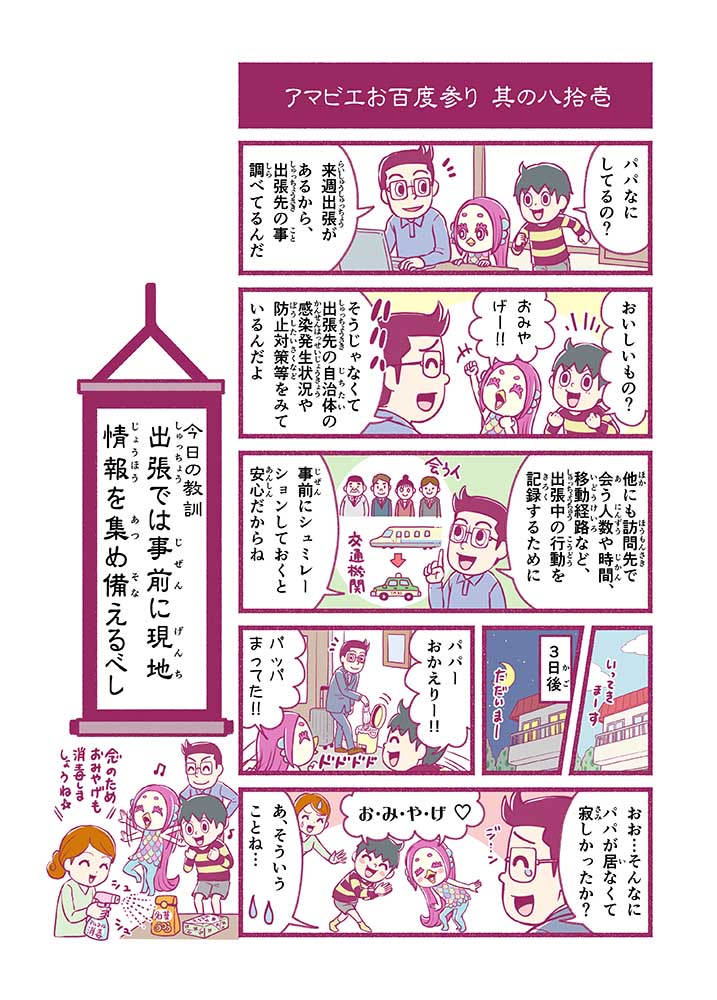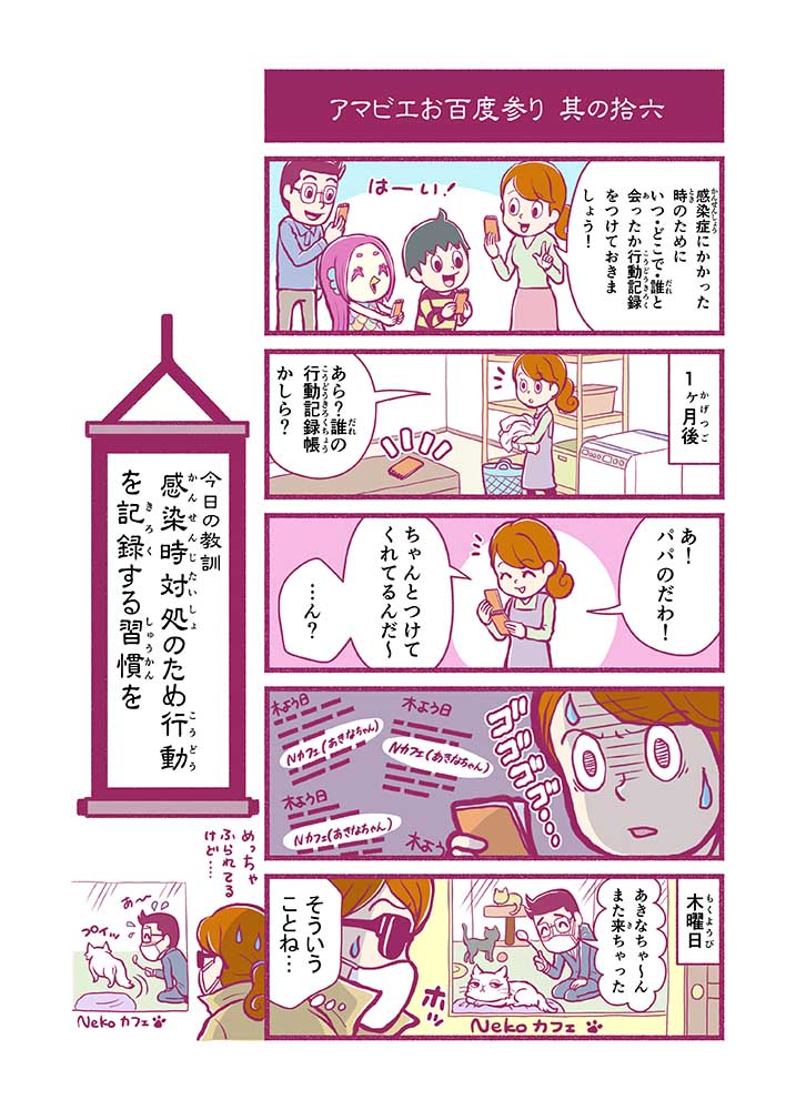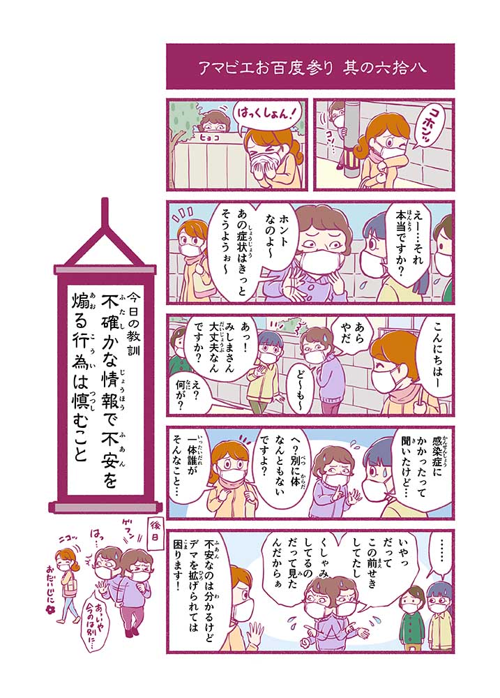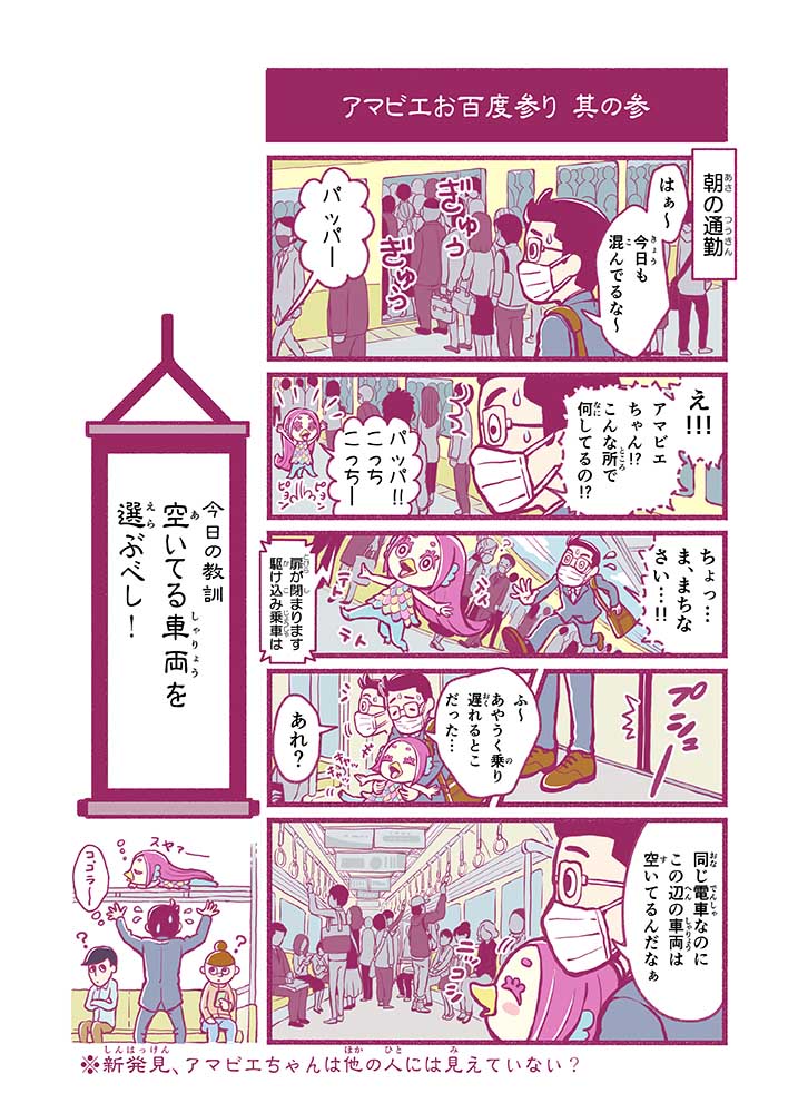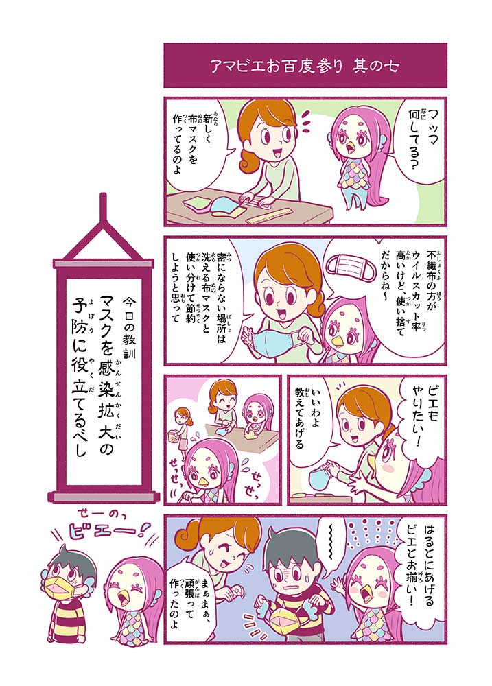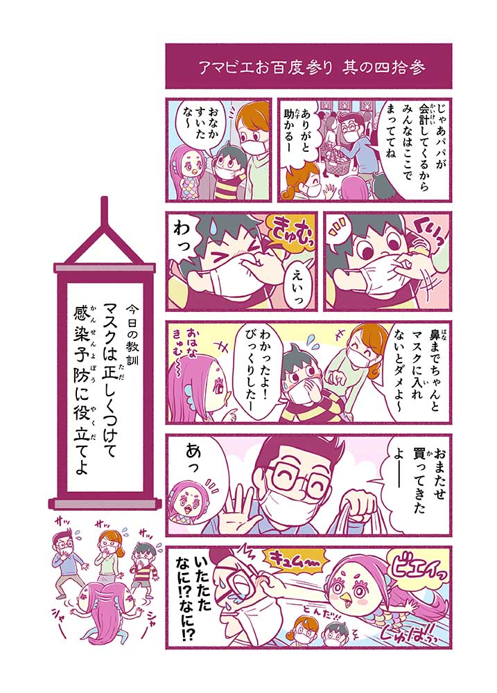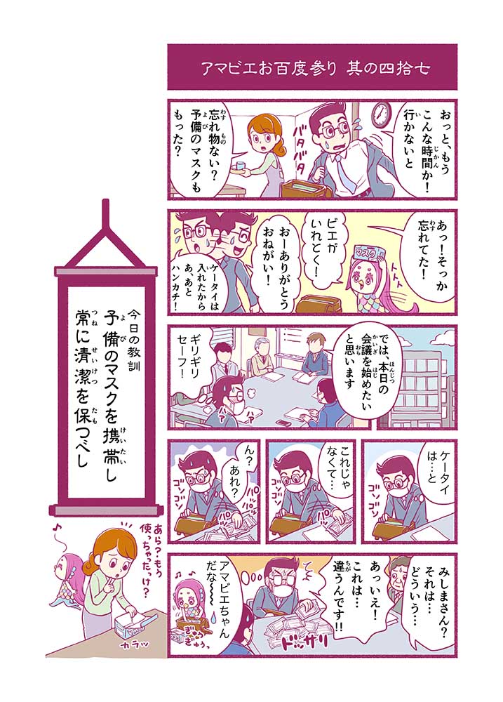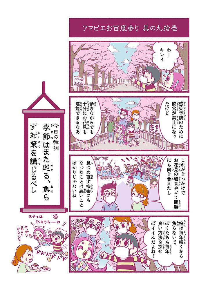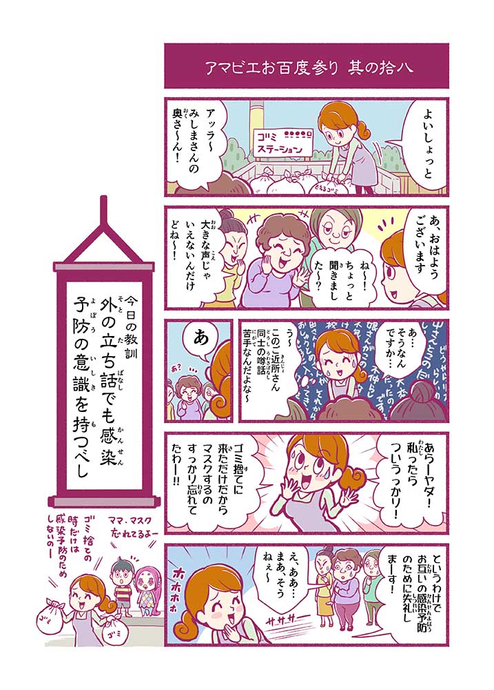 心から叶えたい願いを神様に届ける「御百度参り」をモチーフに100話マンガとして制作しました。 疫病を予言しその予防に備えるように発信したとされる伝説の妖怪アマビエちゃんとともに、新型コロナウイルス対策の一環となるような100作の感染予防マンガを配信しました。