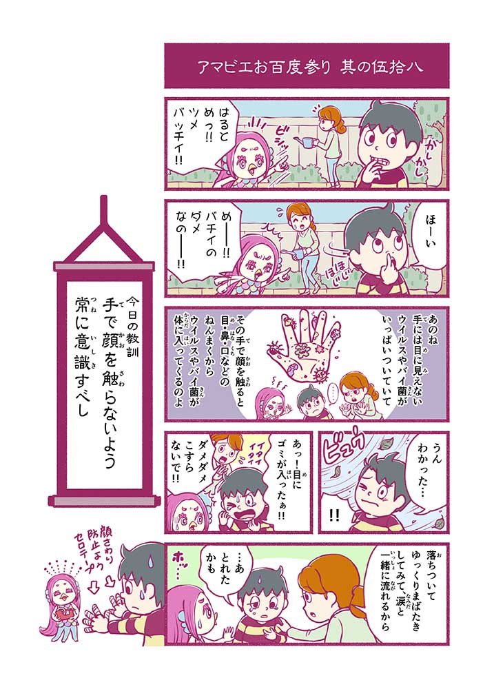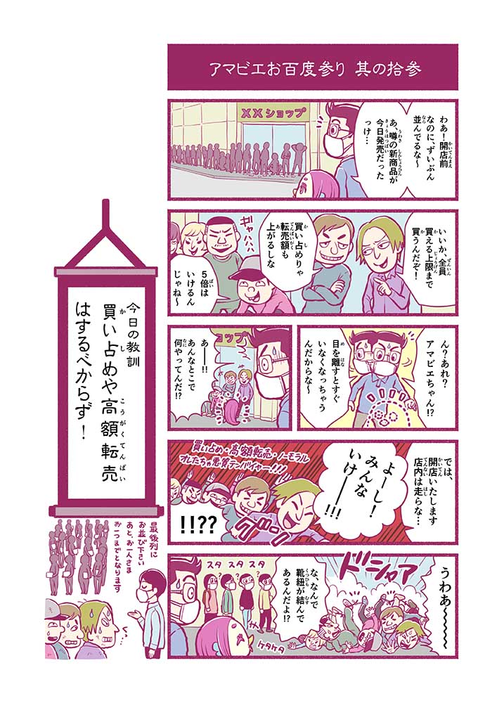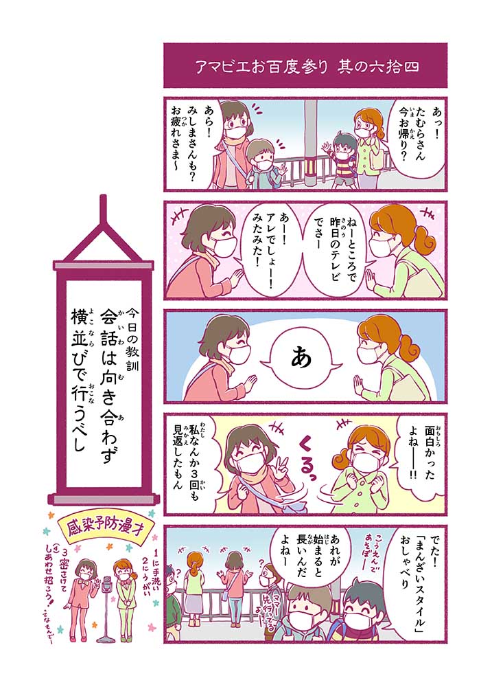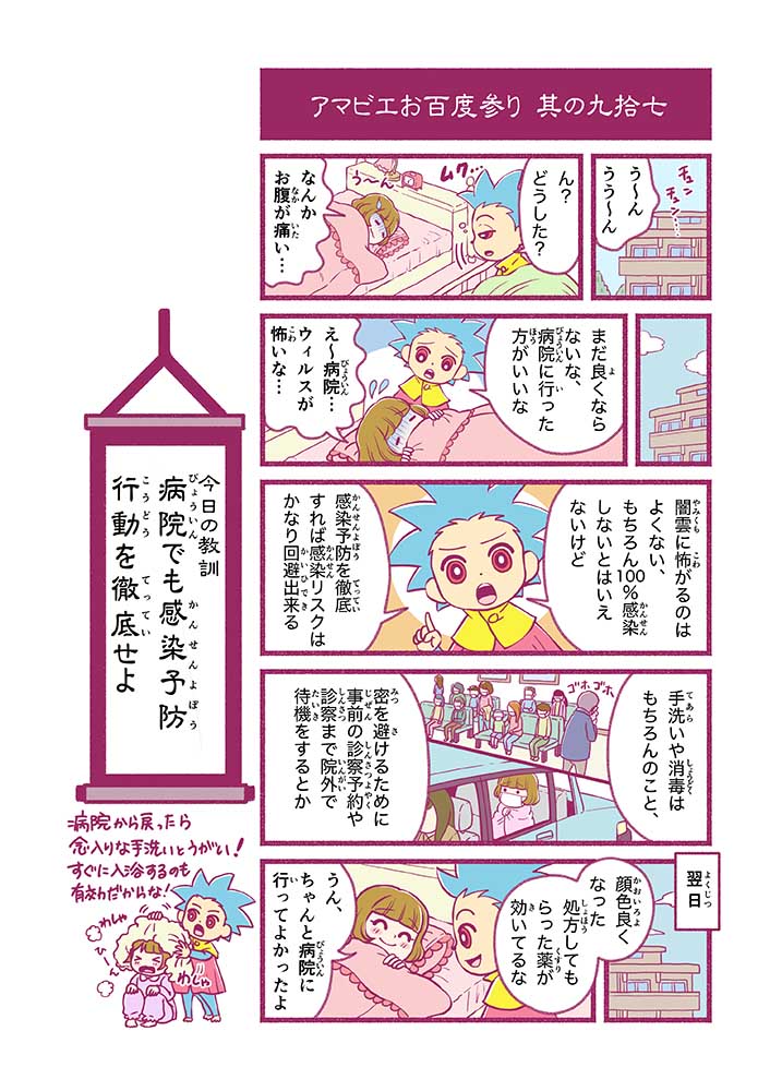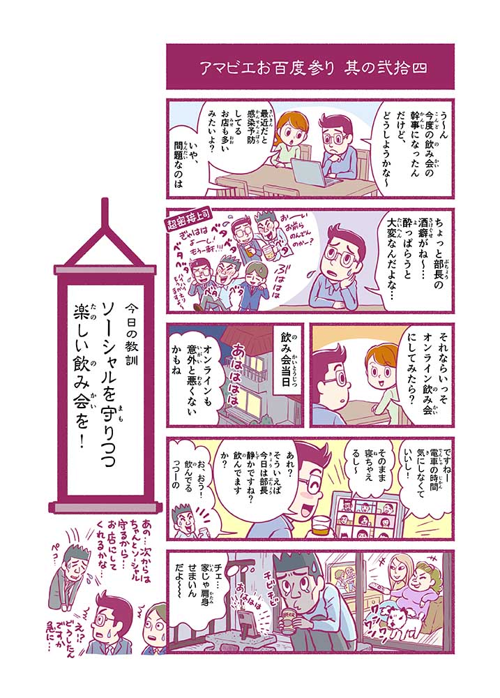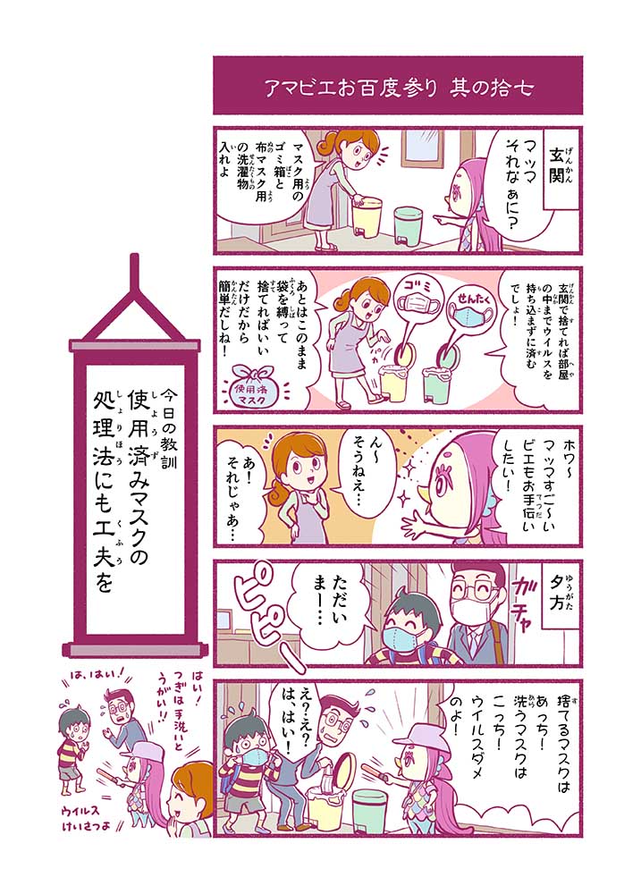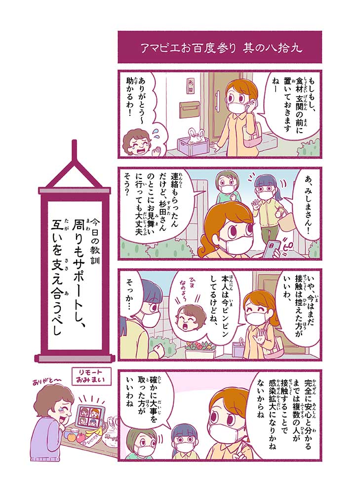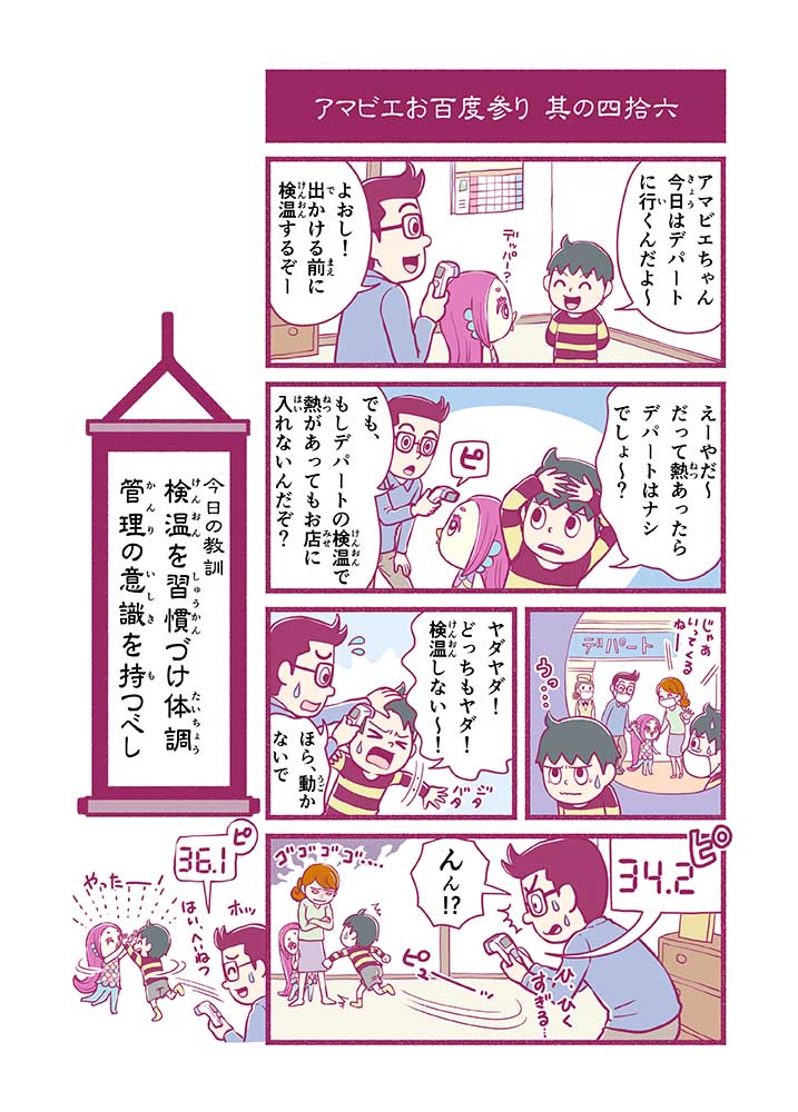 心から叶えたい願いを神様に届ける「御百度参り」をモチーフに100話マンガとして制作しました。 疫病を予言しその予防に備えるように発信したとされる伝説の妖怪アマビエちゃんとともに、新型コロナウイルス対策の一環となるような100作の感染予防マンガを配信しました。
